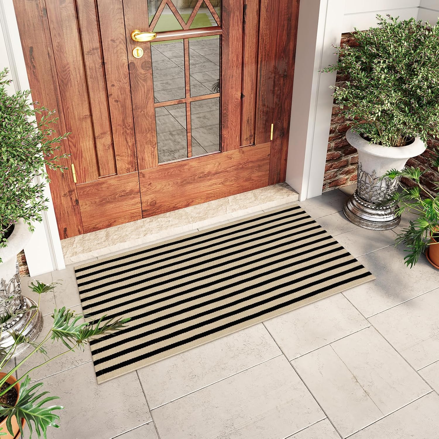 Cotton Woven Washable Front Porch Rugs, Farmhouse Reversible Layered Welcome Mat